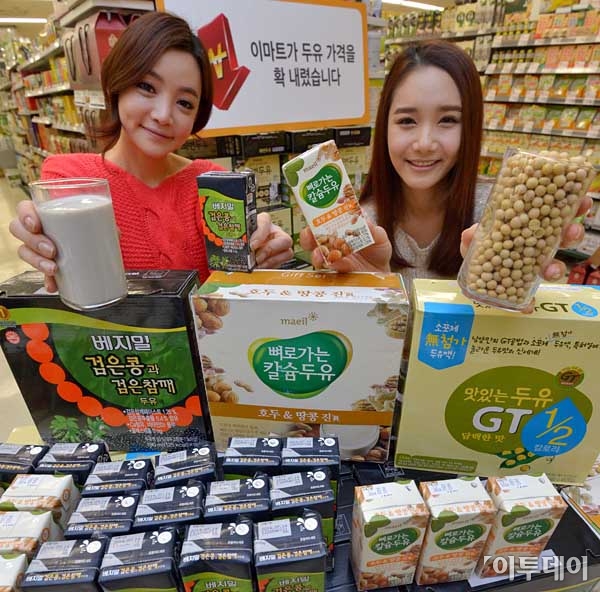 이마트가 2일 오전 서울 이마트용산점에서 두유 '상시저가'판매를 알리는 행사를 갖고 있다. 이마트는 3일부터 두유 31개 품목에 대해 최대 35%까지 인하한 가격으로 판매한다. 최유진 기자 strongman55@