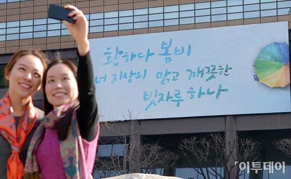 교보생명은 3일 봄을 맞아 서울 광화문 사옥에 설치된 광화문 글판을 맑고 깨끗한 희망의 메시지를 담은 '봄편'으로 새롭게 걸었다. 이날 오전 교보생명 직원들이 광화문 글판 앞에서 사진을 찍고 있다. 최유진 기자 strongman55@