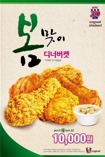 ‘봄맞이 디너버켓’은 KFC 고유의 맛을 즐길 수 있는 치킨 5조각과 치킨과의 환상적인 궁합을 자랑하는 코울슬로로 구성됐다. 저녁 시간대 가벼운 야외 활동을 한 후 간편하게 먹기 좋아 외식메뉴로 안성맞춤이다. KFC의 ‘봄맞이 디너버켓’은 오후 5시부터 저녁 10시까지 만원에 판매한다.