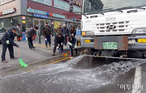 낮으로 포근한 날씨를 보이며 봄이 성큼 다가왔다. 11일 오전 서울 양천구 신정네거리에서 주민들이 도로 물청소를 하면서 봄맞이 준비를 하고 있다. 최유진 기자 strongman55@