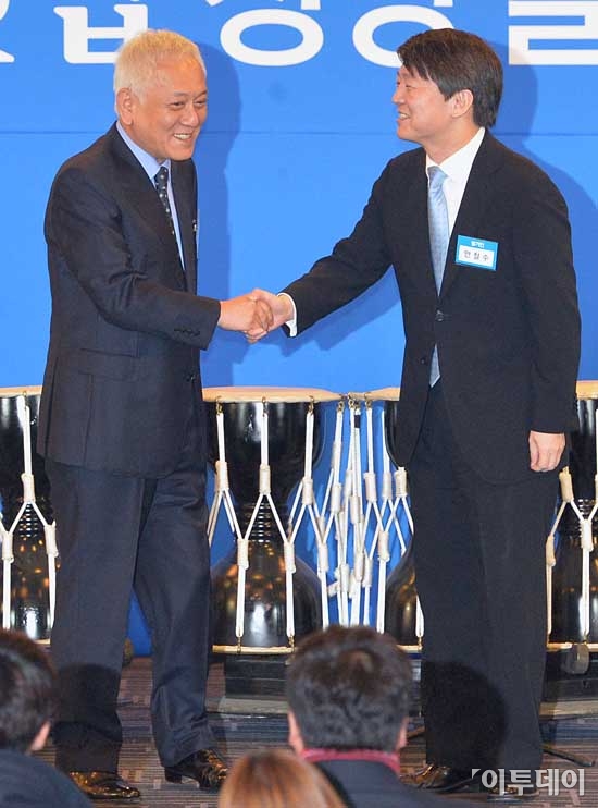 김한길 민주당 대표(왼쪽)와 안철수 새정치연합 중앙운영위원장이 16일 오후 서울 세종문화회관 세종홀에서 열린 새정치민주연합 신당창당준비위원회 발기인 대회에 참석해 악수를 하고 있다. 최유진 기자 strongman55@