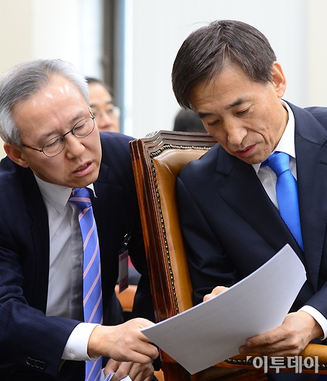이주열 한국은행 총재후보자(오른쪽)가 19일 오전 여의도 국회 기획재정위원회 전체회의에서 열린 인사청문회에 참석해 청문회가 시작되기 전 관계자와 이야기를 나누고 있다. 노진환 기자 myfixer@