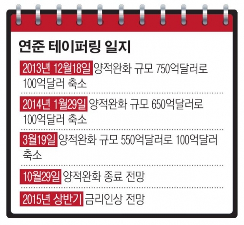 연준은 오는 4월부터 모기지담보부채권(MBS) 매입 규모를 종전의 월 300억 달러에서 250억 달러로, 국채는 350억 달러에서 300억 달러로 각각 줄일 계획이다.