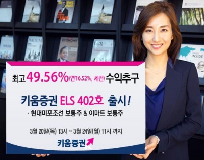 키움증권은 20일부터 24일까지 주가연계증권(ELS) 1종을 공모한다. 이번 공모하는 ‘키움증권 ELS 402호’는 ‘현대미포조선, 이마트’를 기초자산으로 하는 3년 만기 원금비보장형 상품으로 최고 49.56%(연 수익률 16.52%)의 수익을 지급한다.