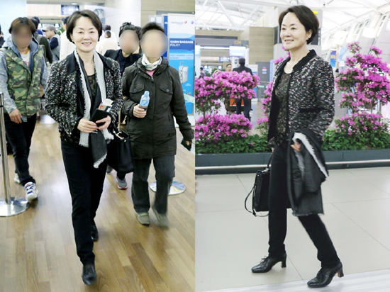 이날 오전 일찍 출국길에 오른 김영애는 모던한 블랙 팬츠와 트위드 스타일의 숏 자킷, 모노톤의 스카프로 포인트로 준 멋스러운 올 블랙 패션으로 그녀만의 우아하면서도 단아한 아름다움을 잃지 않았다.