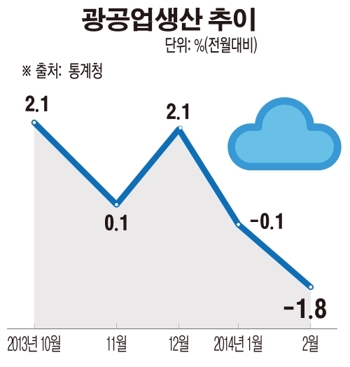 통계청이 28일 발표한 '2014년 2월 산업활동동향'을 보면 지난달 광공업생산은 전달과 비교해 1.8% 하락했다. 당초 지난달 0.1% 상승했던 것으로 발표됐던 1월 광공업생산도 수치를 확정하는 과정에서 -0.1%가 되면서 광공업생산이 두 달 연속 줄어든 것으로 확인됐다. 광공업 생산이 두달 연속 감소한 것은 지난해 2~3월 이후 11개월 만에 처음이다.