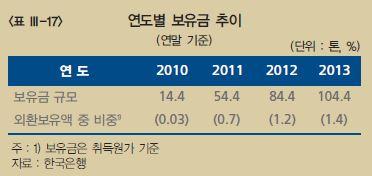 한은 관계자는“과거 금융자산 위주로 외화자산을 운용해 왔으나, 2010년 부터 외환보유액이 3000억달러를 넘어서 안정적으로 유지됨에 따라 장기적인 관점에서 투자 다변화를 위해 실물자산인 금 보유규모 확대를 추진했다”며“지난 2011년 40톤, 2012년 30톤, 2013년 20톤 등 금을 점진적으로 매입했다”고 설명했다.