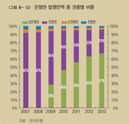 화폐 발행잔액 중 5만원권 비중이 크게 증가한 것으로 나타났다. 지난 2009년 이후 고액권의 화폐 수요가 증가했기 때문인 것으로 보인다.