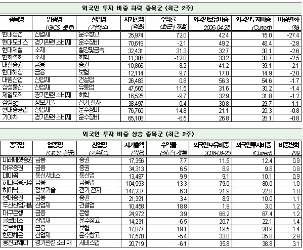 2주간 외국인의 매매를 살펴보면 투자 비중 하락 종목은 현대상선, 현대모비스, 현대제철, 한화석화 등 이었으며 반면 비중이 상승한 종목은 미래에셋증권, 대우증권, 현대증권 등의 증권주가 눈에띄며 데이콤, 웅진코웨이, 글로비스, 한진해운 등 이었다.