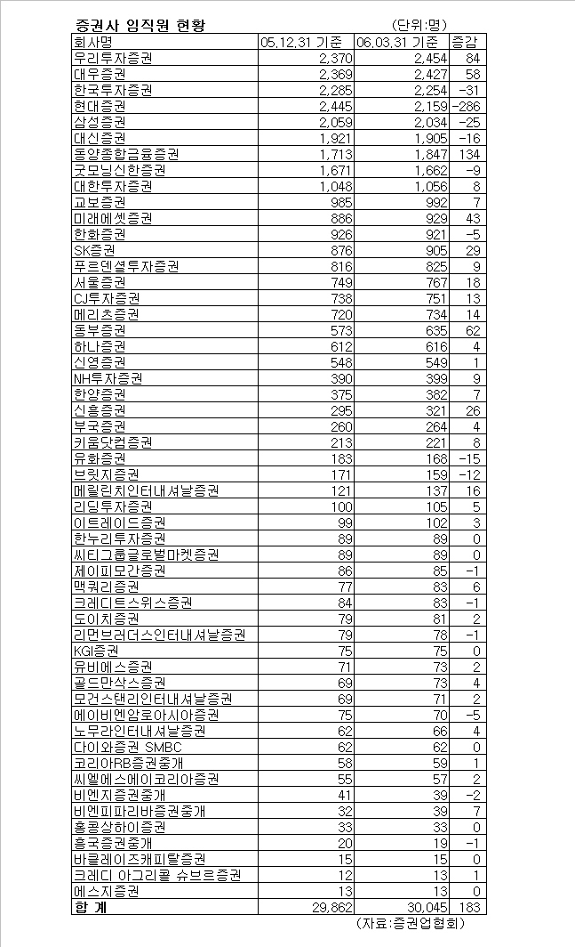11일 증권업협회에 따르면 53개 증권사(외국계 증권사 국내지점 포함)들의 지난 3월말 현재 임직원수는 지난해 말(2만9862명)에 비해 183명 늘어난 3만45명(하단 증권사 임직원 현황표 참조)에 이르는 것으로 나타났다.