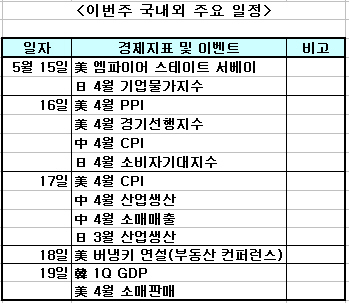 먼저 16일에 미국에서는 4월 생산자물가지수(PPI)와 경기선행지수가 발표될 예정이다.