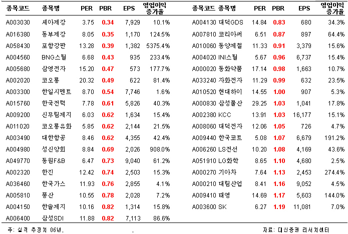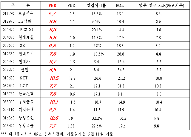 함 연구원은 "화학, 철강, 비금속, 정유, 자동차, 섬유의복, 전기가스, 증권 업종 등이 대신유니버스 보다 낮은 PER을 보이고 있다"며 "이들 업종내 평균 PER보다 낮은 종목군이 시장의 관심"이라고 설명했다.