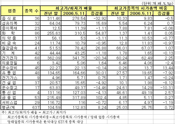 15일 증권선물거래소에 따르면 2005년말 기준 업종내 최저가 대비 최고가 종목은 평균 104.6배 높았으나 올해 5월 11일 현재는 평균 112.8배로 확대된 것으로 나타났다.