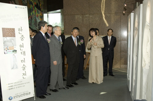 굿모닝신한증권이 15일부터 서울 여의도 본사 빌딩에서 ‘한중현대미술전’과 '작은음악회'를 개최한다. 사진은 굿모닝신한증권 이동걸 사장(사진 맨왼쪽)이 내외 귀빈들과 함께 작품 설명을 듣고 있는 모습이다.