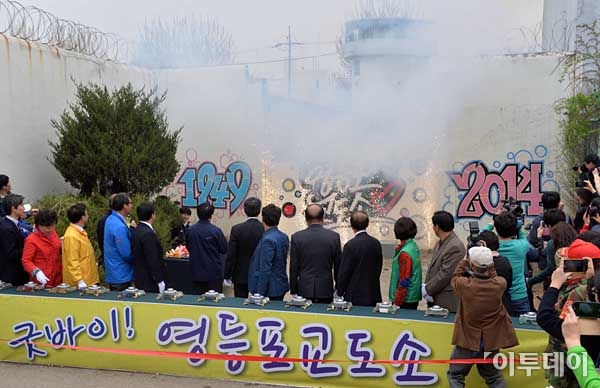 영등포교도소가 65년 만에 철거를 앞두고 3일 시민들에게 공개됐다. 이날 '굿바이 영등포교도소' 행사로 벽을 허무는 퍼포먼스가 서울 구로구에 위치한 교도소에서 진행되고 있다. 영등포교도소는 1949년 부천형무소란 이름으로 문을 열어 부천교도소, 영등포교도소, 서울 남부교도소로 명칭이 변경됐으며 2011년 10월 천왕동으로 이전했다. 최유진 기자 strongman55@