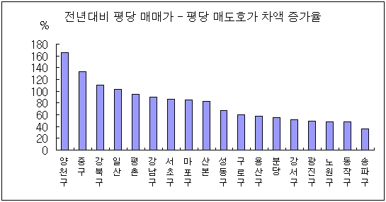 목동의 매매가·호가 격차는 지난해 평당 27만원에서 85만원으로 뛰어 218.44%의 증가세를 보였고, 다음으로 평촌신도시 94.96%(20만원→38만원), 강남구 89.70%(19만원→25만원), 서초구 86.22%(35만원→65만원)가 뒤를 이었다.