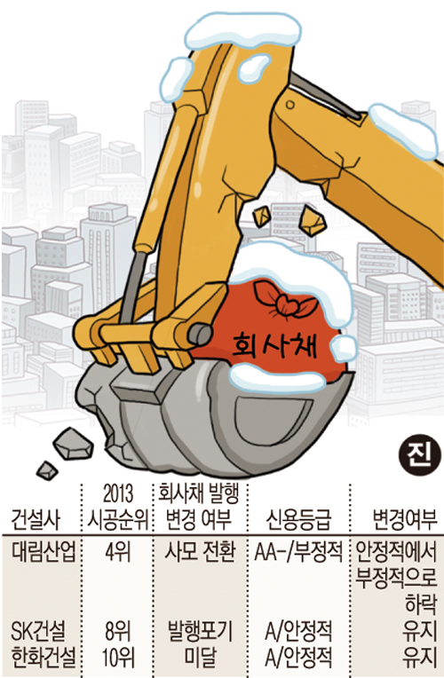 한편 한국신용평가는 전일 한화건설과 SK건설 신용등급을 각각 A0(안정적)으로 유지했다. 그러나 대림산업은 신용등급만 AA-로 유지됐고 등급전망이 ‘안정적’에서 ‘부정적’으로 내려갔다.