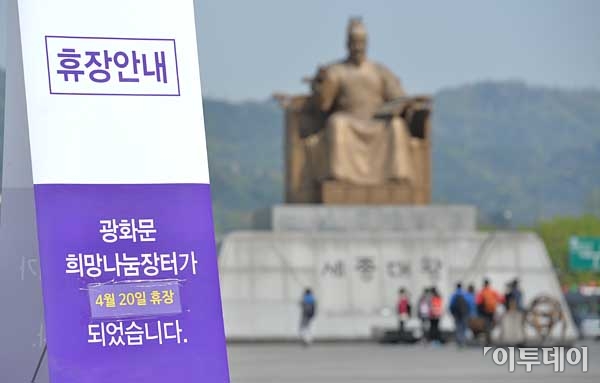 세월호 침몰사고로 각종 축제와 행사가 취소 또는 축소되며 애도행렬에 동참하고 있다. 20일 오전 서울 광화문 광장에 행사의 취소를 알리는 안내문이 내걸려 있다. 최유진 기자 strongman55@