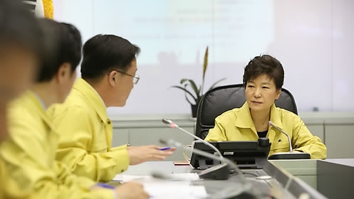 ▲박근혜 대통령이 진도 해상에서 발생한 세월호 침몰 사고와 관련 16일 오후 정부서울종합청사 중앙재난안전대책본부를 방문, 생존자 구조에 최선을 다해달라고 당부하고 있다.(연합뉴스 )