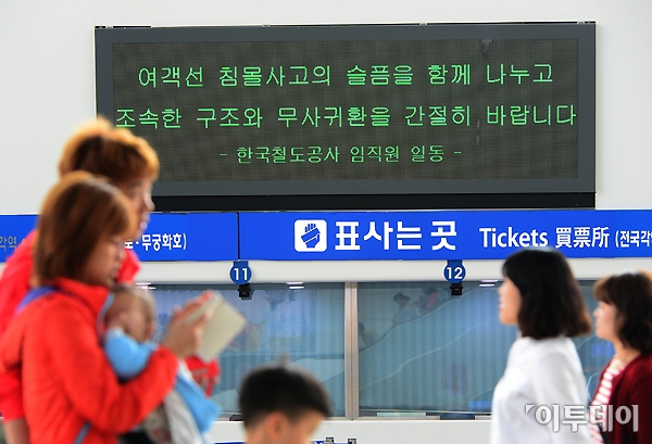 여객선 ‘세월호’ 침몰 사고 엿새째인 21일 오후 서울역 대합실 전광판에 ‘여객선 침몰사고의 슬픔을 함께 나누고 조속한 구조와 무사귀환을 간절히 바랍니다’ 라는 메시지가 나오고 있다. 노진환 기자 myfixer@