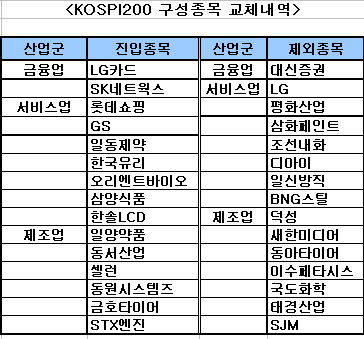 이에따라 코스피200지수에는 LG카드, 롯데쇼핑, SK네트웍스, GS, 한솔LCD 등 15종목이 신규편입된 반면 대신증권, LG, BNG스틸 등은 제외된다.