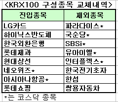 이와함께 LG카드, 하이닉스, 외환은행, 네오위즈 등 8종목은 KRX100에 진입했으며 파라다이스, 한섬, 쌍용자동차 등 8종목은 제외된다.