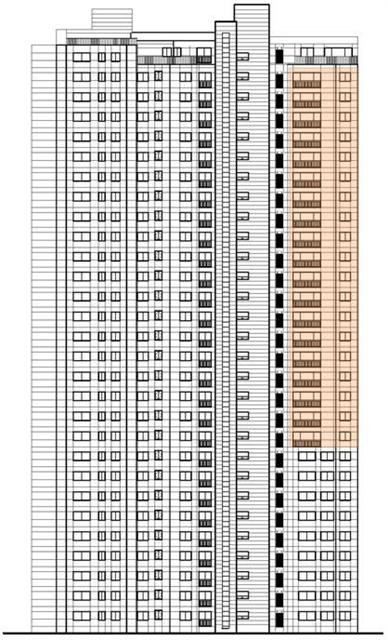 또한 특화평면이 들어가는 라인에 적용되는 ‘상·하부 이형 세대배치’는 층수에 따른 채광과 조망의 차이를 고려해 10~28층에는 특화평면 세대를, 1~9층에는 거실 남향 세대를 배치하는 것으로 그동안 국내 아파트에서는 사례가 없는 것으로 알려졌다. 상하부 세대의 방의 위치는 동일하지만 거실-주방 위치가 반대가 된다. 이와 함께 전·후면 외부 창호의 위치도 바뀌어 독특한 외관을 갖게 된다.