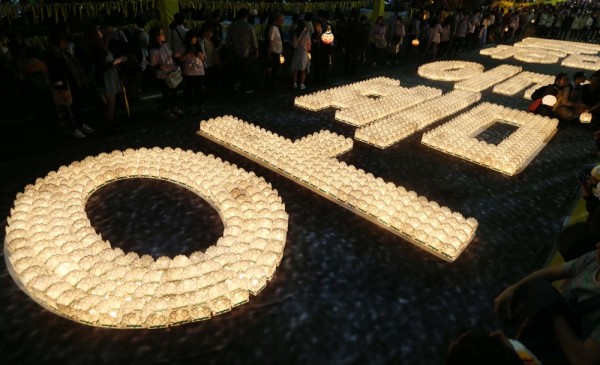 26일 서울 종로 일대에서 연등행렬이 펼쳐진 가운데 세월호 침몰 사고의 슬픔과 고통을 함께 나누는 의미로 연등을 놓아 만든 '아픔을 함께'라는 글씨가 어둠을 밝히고 있다.