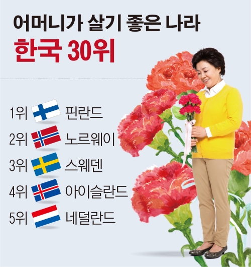 국제 구호개발 NGO 세이브더칠드런은 6일 '2014 어머니 보고서'를 통해 세계 178개국을 상대로 어머니와 아동이 살기 좋은 나라를 조사한 결과 한국이 30위를 기록했다고 밝혔다. 지난해에 비해 1계단 상승한 것이다.