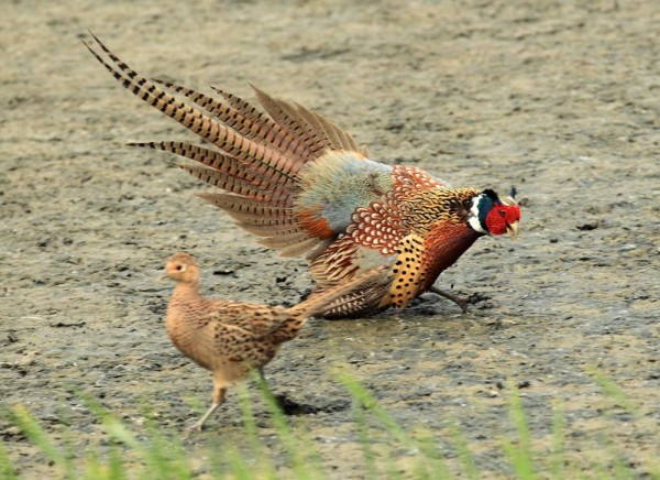 12일 강원 강릉시 남대천 하구에서 장끼 1마리가 몸을 크게 부풀린 채 까투리에게 구애 행동을 하고 있다.