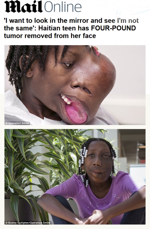얼굴에 커다란 종양을 가진 아이티의 15세 소녀가 미국에서 제거 수술을 받고 새 삶을 되찾았다고 15일(현지시간) 영국의 데일리 메일이 보도했다. 핸글리스 도비알이라는 이 소녀의 얼굴 종양은 4세때부터 생긴 후 점점 커지면서 2kg에 육박했다. 이 수술은 개발도상국의 어린이 얼굴기형 수술을 후원하는 '오퍼레이션 스마일'이라는 자선단체의 후원으로 이뤄졌다. 사진 위는 도비알의 수술전 모습이며 아래는 수술 후의 모습.