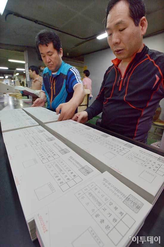 6·4 지방선거를 2주 가량 앞 둔 19일 오후 서울 영등포구의 한 인쇄소에서 직원들이 인쇄된 투표용지를 살펴보고 있다. 최유진 기자 strongman55@