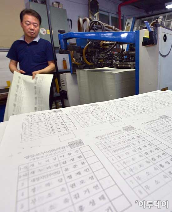 6·4 지방선거를 2주 가량 앞 둔 19일 오후 서울 영등포구의 한 인쇄소에서 인쇄된 투표용지가 쌓여있다. 최유진 기자 strongman55@
