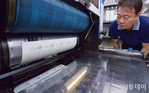 6·4 지방선거를 2주 가량 앞 둔 19일 오후 서울 영등포구의 한 인쇄소에서 직원이 인쇄되는 투표용지를 살펴보고 있다. 최유진 기자 strongman55@