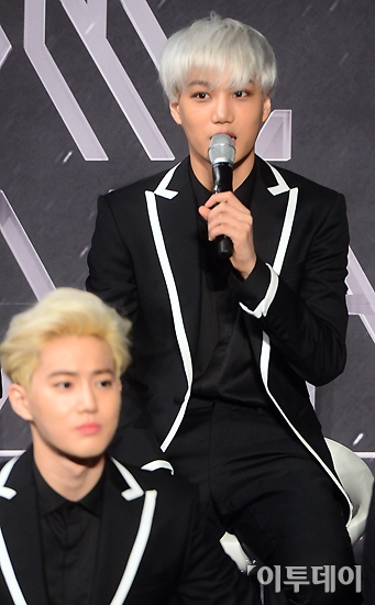 아이돌 그룹 엑소가 25일 오후 서울 올림픽공원 체조경기장에서 “EXO FROM. EXOPLANET #1-THE LOST PLANET-” in SEOUL 콘서트를 개최했다. 엑소의 카이가 기자회견에 참석해 소감을 밝히고 있다. 노진환 기자 myfixer@