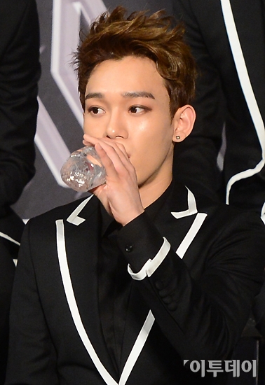 아이돌 그룹 엑소가 25일 오후 서울 올림픽공원 체조경기장에서 “EXO FROM. EXOPLANET #1-THE LOST PLANET-” in SEOUL 콘서트를 개최했다. 기자회견에 참석한 엑소의 첸이 물을 마시고 있다. 노진환 기자 myfixer@