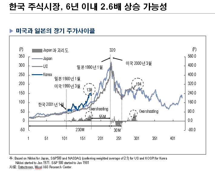 한국 주식시장이 미국과 일본처럼 향후 6년 이내에 2.6배 상승가능하며 이 경우 코스피지수는 2880p, 코스닥지수는 1870p까지 오를 수 있다는 것이다.