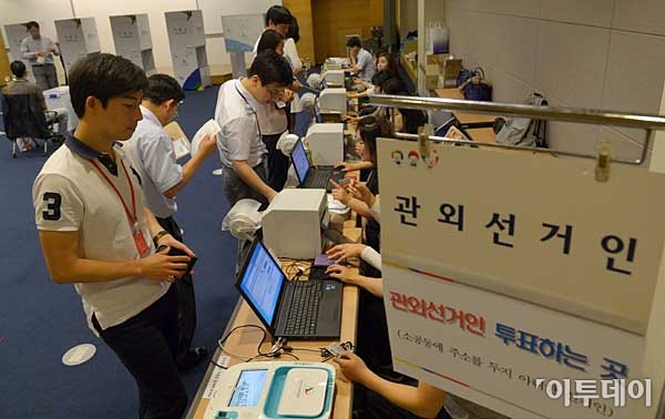 사전 투표가 전국 단위 선거로는 처음으로 30일과 31일 이틀동안 실시된다. 30일 오전 서울 중구 대한상공회의소에 설치된 소공동사전투표소에서 유권자들이 투표를 하고 있다. 최유진 기자 strongman55@