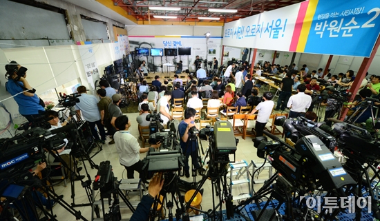 제6회 지방선거가 열린 4일 오후 종로구 박원순 선거캠프에 출구조사 발표시간이 임박해오자 박원순 후보 지지자들이 캠프에 속속 몰려들고 있다.
