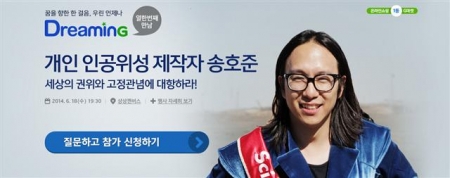 세계 최초로 개인 인공위성 발사 프로젝트를 성공시킨 미디어 아티스트 송호준씨는 ‘세상의 권위와 고정관념에 대항하라!’를 주제로 얘기할 예정이다. 참가신청은 10일까지 G마켓 이벤트 페이지(gmkt.kr/tHr0-qzo)에서 ‘참가 신청’ 버튼을 클릭한 후 강연자 송호준씨에게 묻고 싶은 질문을 남기면 된다. 추첨을 통해 당첨된 60명은 18일 수요일 오후 7시부터 동자동 상상캔버스에서 진행되는 ‘드리밍’ 행사에 참여할 수 있다.