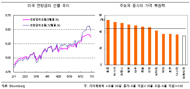 실제로 미국 금리인상이 마무리됐거나 연내 0.25%포인트 인상에 그칠 것이란 예상이 늘어나고 있으며 연방 금리선물시장에서도 8월 금리인상 가능성이 50%이하로 낮아진 상태다.