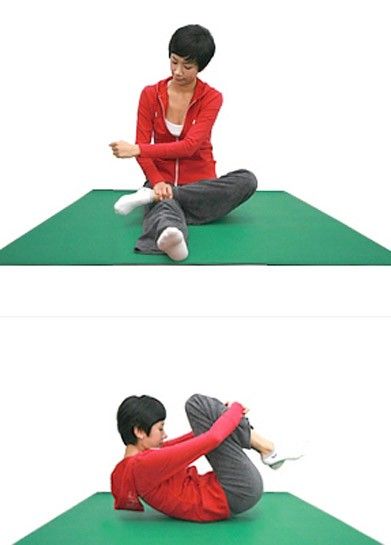 다음으로 '허리-등-목 뒤편까지 자극이 가도록 구르기' 동작을 한다. 무릎을 굽혀 두 팔로 감싸 안은 후 목을 앞으로 숙이고 뒤로 넘어졌다 일어나는 방식으로 구르면 된다.