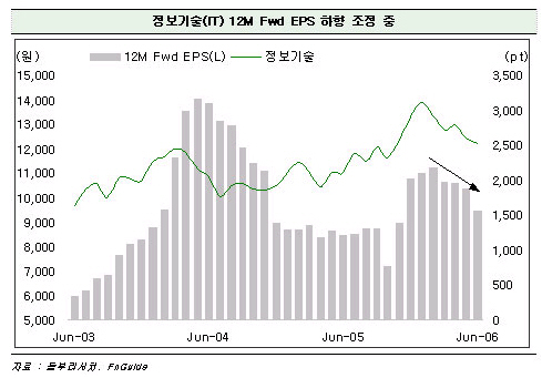 주 연구원은 또 "주요 IT지수와 향후 12개월EPS(주당순이익) 흐름을 살펴본 결과 시장에 이익모멘텀을 제공하는 가장 큰 요소는 IT업종"이라며 "EPS 하향시기에는 정보기술(IT)업종의 지수 조정도 발생됐었다"고 분석했다.