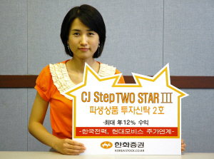 한화증권은 오는 13일부터 14일까지 이틀간 한국전력과 현대모비스 보통주를 기초자산으로 한 파생상품에 투자하는 'CJ Step Two-Star Ⅲ 파생상품투자신탁 2호'를 판매한다고 밝혔다.