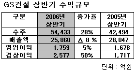 GS건설이 12일 공정공시를 통해 2006년 상반기 잠정실적을 발표했다. 신규 수주는 2005년 동기보다 28% 증가한 5조4430억원을 달성해 올해 수주 목표인 8조8천억원의 60% 이상을 상회하는 성과를 나타냈다.