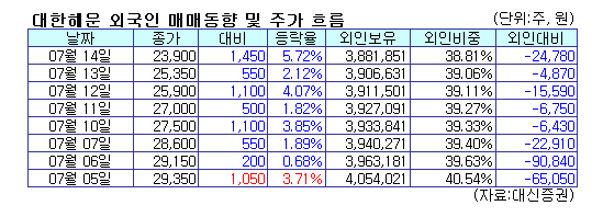 지난 5일 2만9350원(종가 기준)까지 상승했던 대한해운 주가는 7일연속 하락세로 현재 2만3900원을 기록중이다.