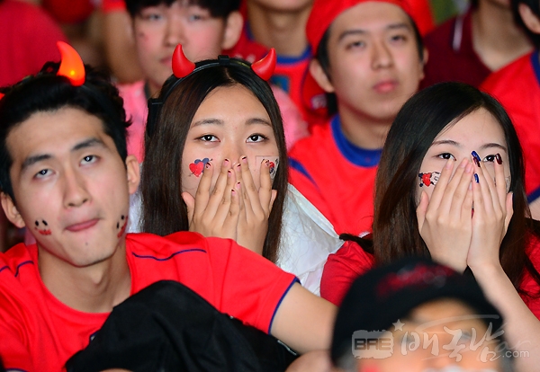 2014 브라질 월드컵 H조 2차전 대한민국 대 알제리 전이 열리는 23일 오전 서울 삼성동 코엑스 앞 영동대로에서 알제리에 연속으로 골을 허용하자 시민들이 실망하는 표정을 보이고 있다. 노진환 기자 myfixer@