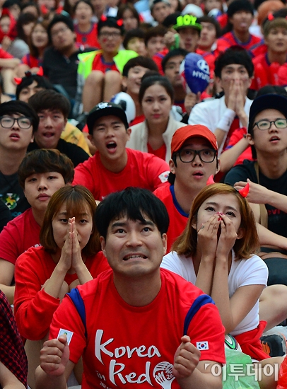 2014 브라질 월드컵 H조 2차전 대한민국 대 알제리 전이 열리는 23일 오전 서울 삼성동 코엑스 앞 영동대로에서 대한민국 축구 대표팀이 안타까운 기회를 날려버리자 시민들이 실망하는 표정을 보이고 있다. 노진환 기자 myfixer@