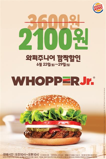 버거킹코리아는 29일까지 ‘와퍼주니어(단품)’를 2100원에 판매하는 깜짝 할인 프로모션을 진행한다고 23일 밝혔다