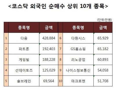 [코스닥 외국인 순매수 상위 10개 종목]